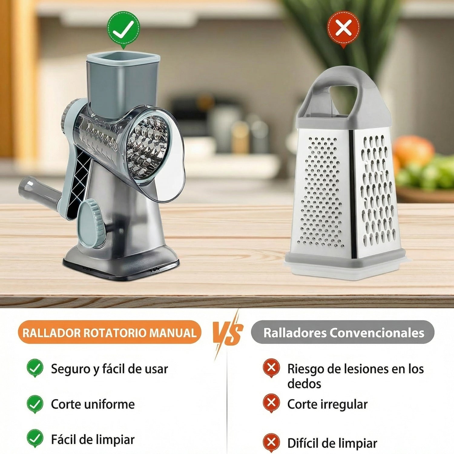El rallador rotatorio manual ofrece un corte uniforme, un uso más seguro y un manejo mucho más cómodo.